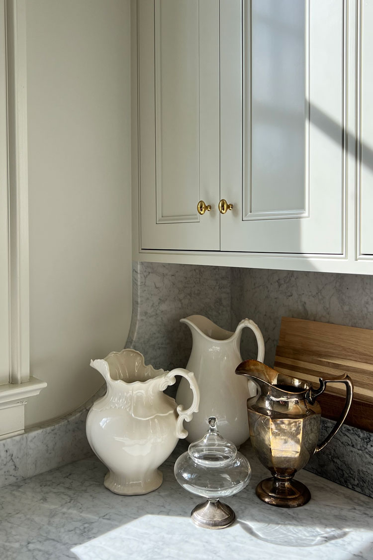 I had a fairly clear concept that I wished darkish soapstone for the worktable inset and a lighter marble for the perimeter cupboards and backsplash. Selecting the precise stones got here right down to price range and what was accessible at native stone yards. Choosing the soapstone was simple; I opted for one with inexperienced undertones from Brazil. Nonetheless, the selection of marble was a bit more difficult. I used to be initially drawn to Calcatta Gold however discovered it to be out of price range. After intensive looking out, Alyssa from Rocktops helped me choose Carrara Bianco. The cool gray tones complement the nice and cozy white of the cupboards and brass {hardware}. The stone reveals stunning motion with out being overly busy, and there are even some areas on the slabs I selected which have hints of brown, an ideal contact of heat.