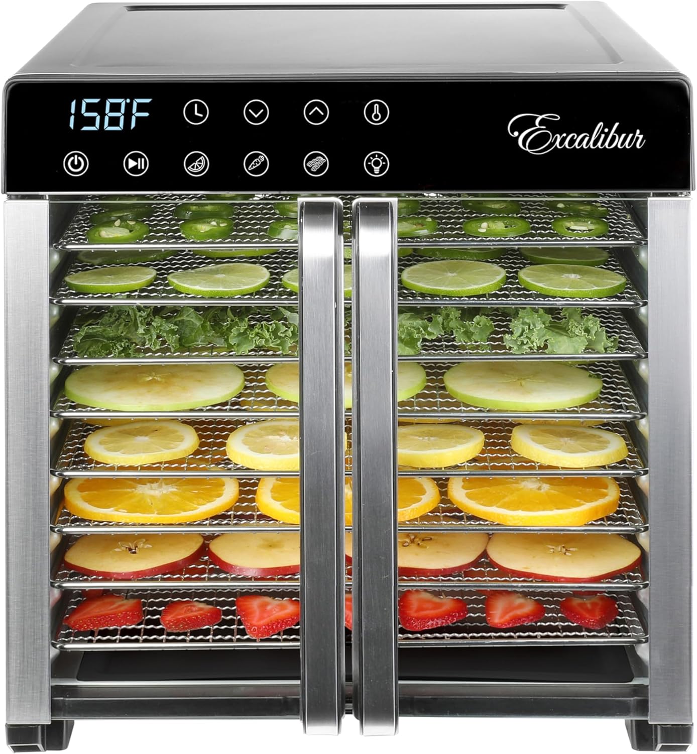Expertise the ability of preservation with the Excalibur Compact 8 Tray dehydrator. Designed for each type and effectivity, this expertly crafted stainless-steel dehydrator presents 7.2 sq. ft of drying house and comes outfitted with eight chrome trays, offering loads of room to fulfill all of your preservation wants. Whether or not you’re preserving your seasonal harvest, your recent catch or just geting artful and experimenting with artistic, nutritious snacks, this compact dehydrator delivers nice outcomes with ease and precision. Mixed, the Hyperwave Know-how together with the Horizontal Parallex Air Circulation guarantee superior efficiency by delivering sooner, extra even drying with out the necessity to rotate the trays. Set exact time and temperature with the easy-to-use LED management panel which provide a temperature vary from 85°F to 165°F and dehydrating time for as much as 80 hours. When in use, the countdown timer is conveniently displayed on the display screen and the unit will mechanically shut off when drying is full. Monitor the drying course of via the clear easy-view glass French door. Discover the world of preservation with a dehydrator that’s deserving of your countertop house. A digital copy of the “Protect it Naturally”ebook is included to encourage your dehydrating journey. Uncover the world of preservation together with your new dehydrator.