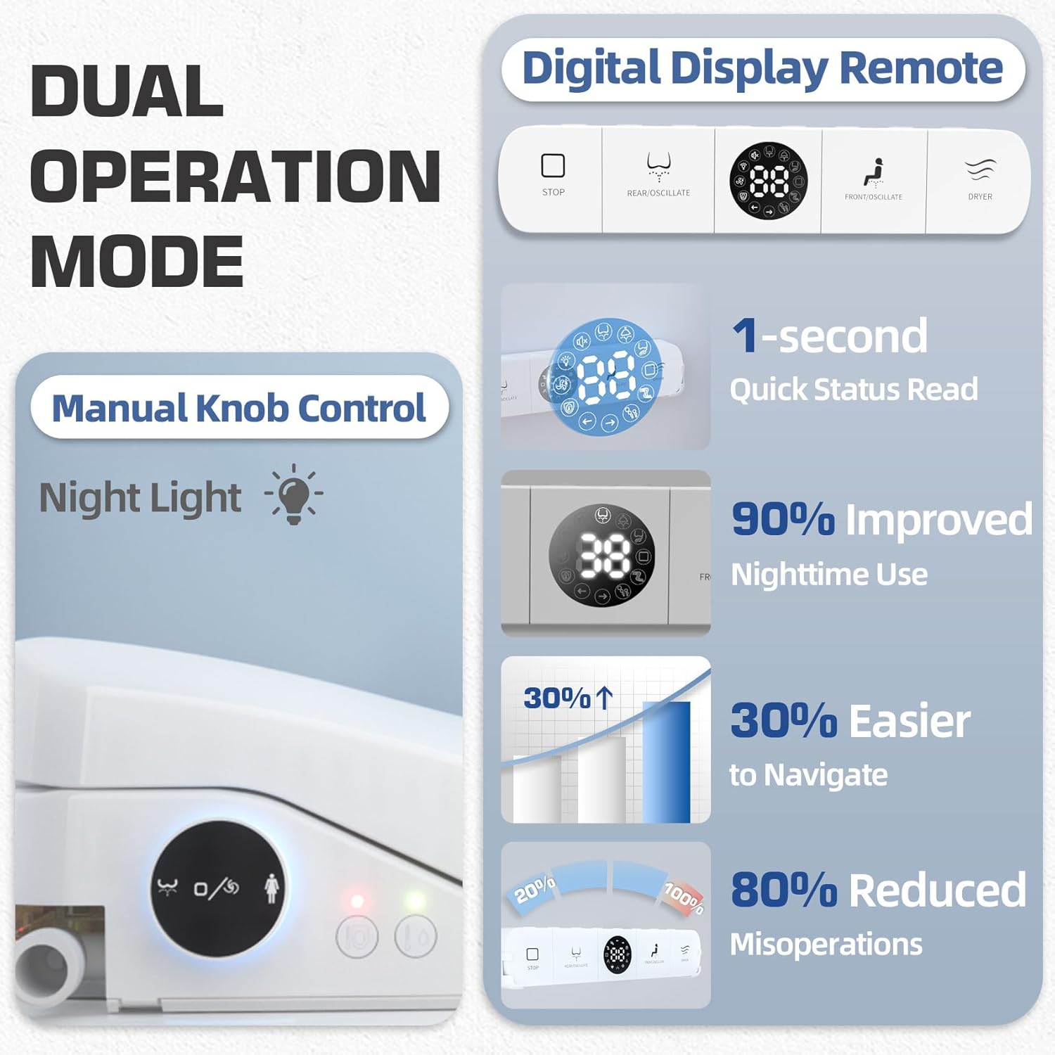 Dual Control Convenience: Enjoy the flexibility of a sleek 【Digital Remote】 and a 【Knob Control 】with Night Light, offering 1-second quick status read, 90% improved nighttime use, 30% easier navigation, and 80% reduced misoperations for a seamless, intuitive experience. You’ll enjoy complete peace of mind and confidence in every interaction even in the dark.