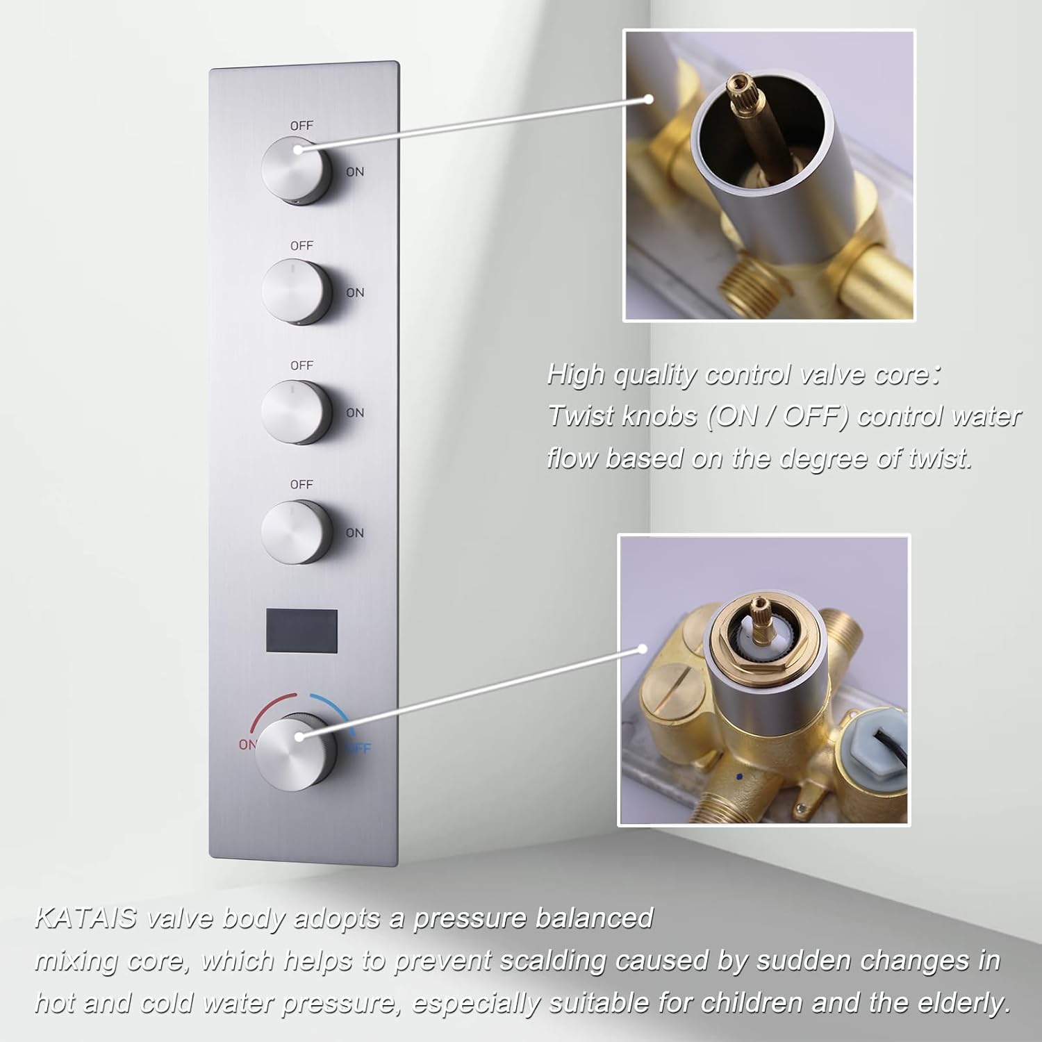 KATAIS Shower Faucets Sets Complete: With LED digital display valve and (F°) temperature design, it is easy to know the current water temperature and duration of use in real time. It operates without external power sources, relying solely on water flow