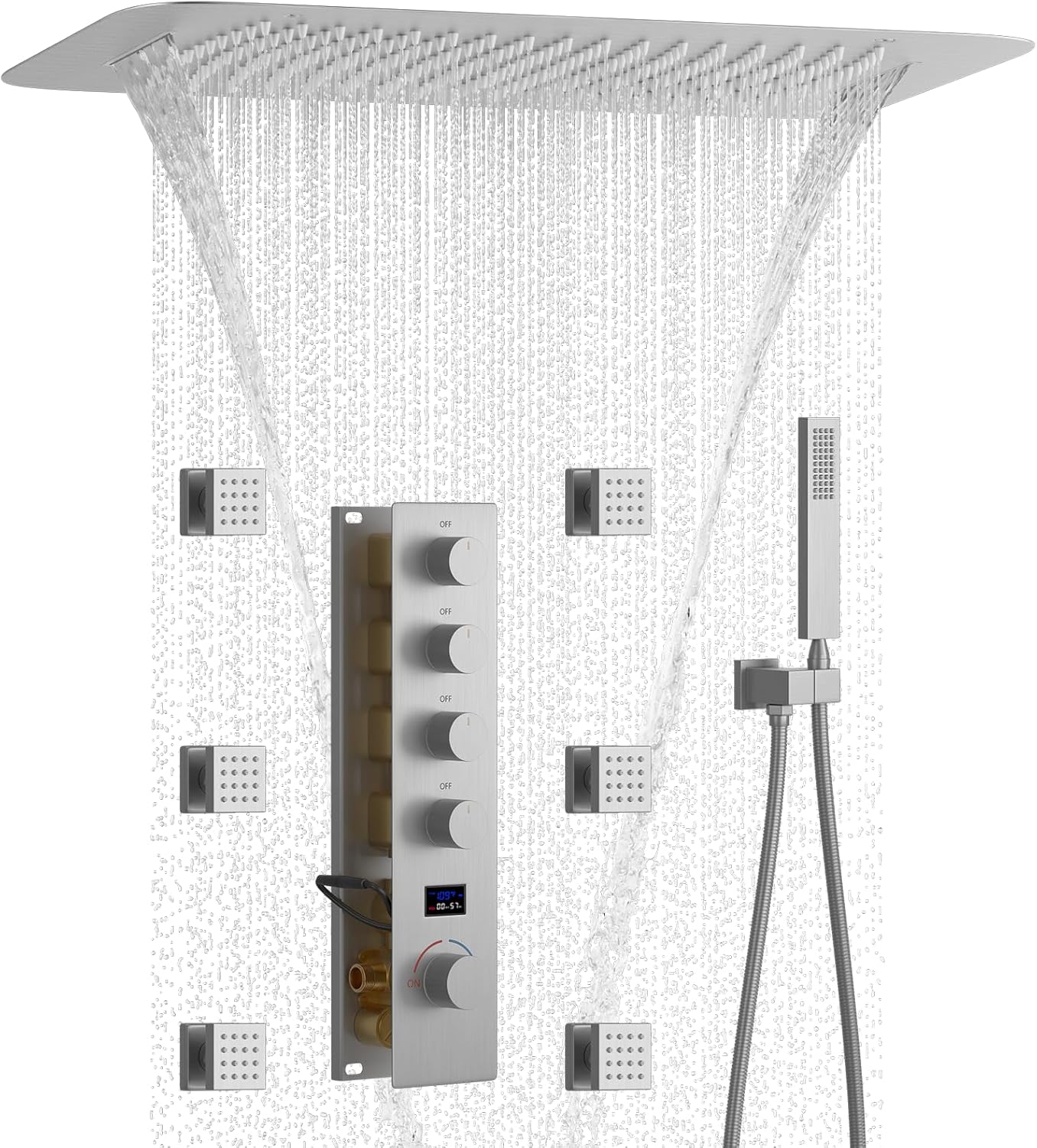 Maintenance and Service Support: Shower faucet system with non-clogging silicone nozzles to make maintenance easy. A dedicated support team is available 24/7 to help you, and the brushed nickel shower system comes with 5 years of limited support