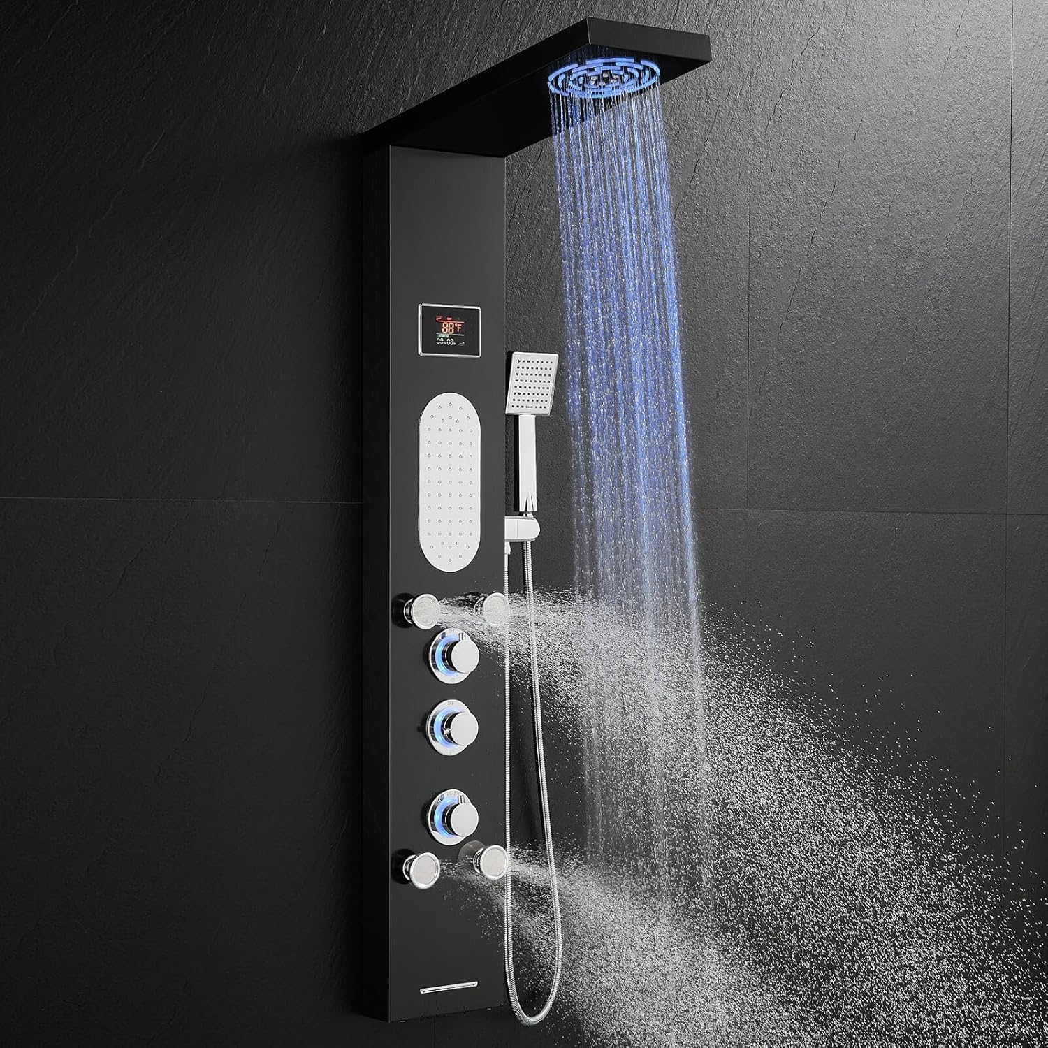 ROVOGO LED Shower Panel Tower System with Mist Rainfall Shower Head, Body Jets, Handheld and Tub Spout, No Battery Led Lights and Digital Display, Simultaneous Shower Column Stainless Steel, Black