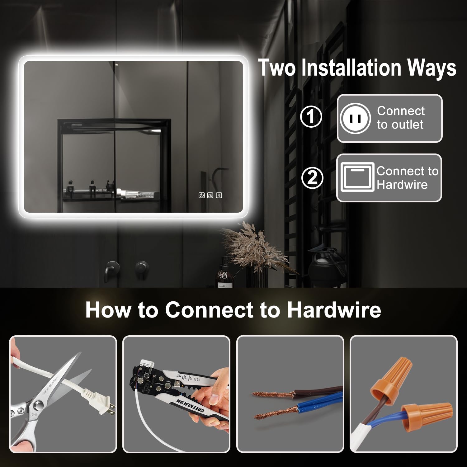 【Easy to Install】 It can be mounted on the wall as a wall-mounted mirror, all installation accessories and installation instructions are included in the package. Pls note it is plug in. For safety reasons, we strongly recommend a professional electrician to install this product if you want to connect directly to the power cord.