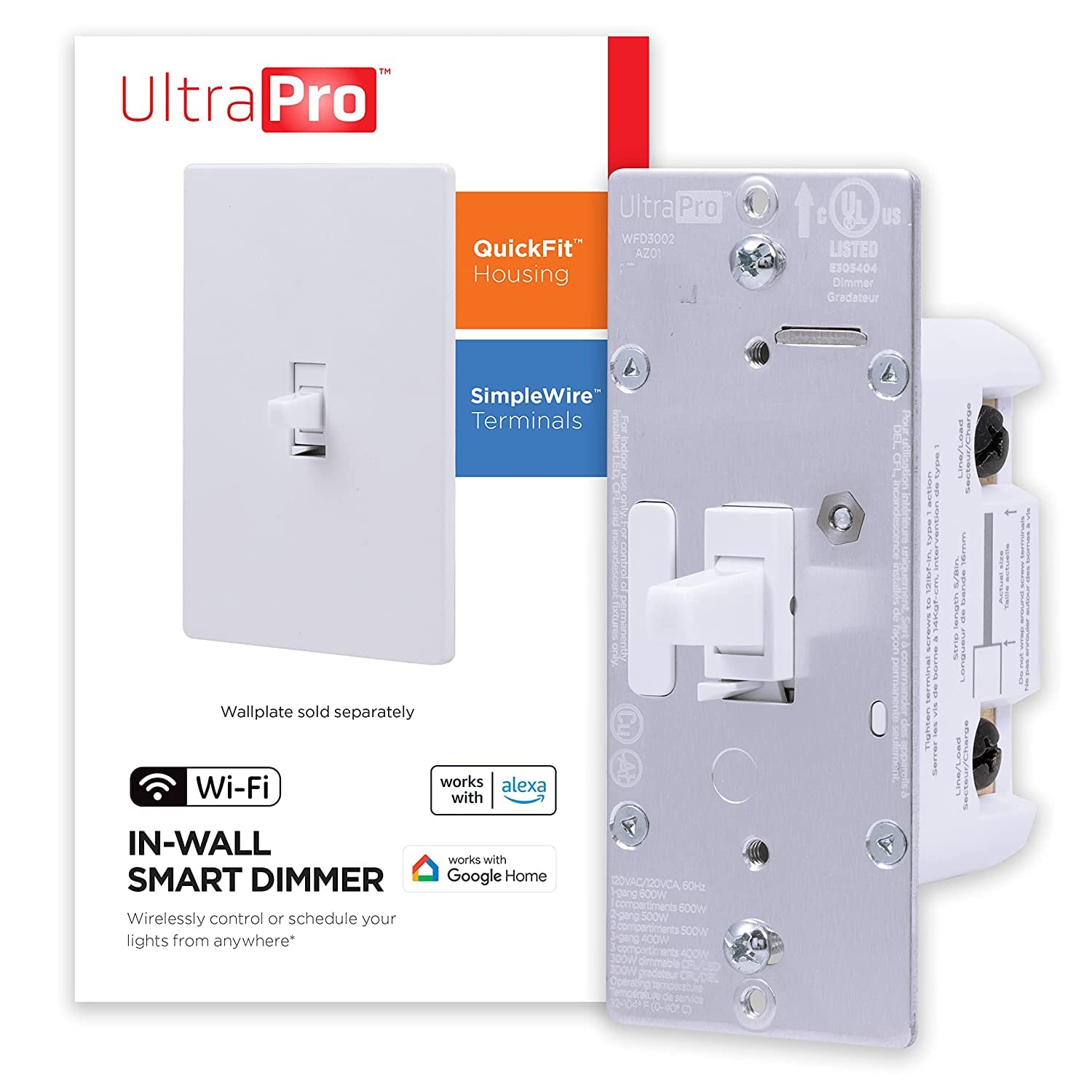 Enjoy professional automation with DIY ease from the UltraPro™ In-Wall Wi-Fi Smart Toggle Dimmer. Connect the smart dimmer to a 2.4GHz Wi-Fi network to control, adjust brightness and schedule permanently installed wall, ceiling, and accent lights. By supporting dual- and tri-band routers, the dimmer is ideal for the latest home Wi-Fi equipment. The easy-to-use UltraPro app with hassle-free pairing options is available on the Apple App Store and on Google Play. Direct compatibility with Amazon Alexa and Google Assistant allows convenient voice commands without a hub. QuickFit™ and SimpleWire™ technologies make installing the dimmer faster and easier than traditional smart devices. Patented auto-detecting line/load terminals eliminate wiring guesswork while offset dual ground ports support daisy chaining in multi-gang uses. The dimmer is compatible with dimmable LED, CFL and incandescent bulbs. To fully automate your life, connected lights are controlled by scheduled settings, sunrise, sunset, weather changes, location and countdowns. Custom commands support operation around the clock while timer and brightness presets allow lighting control with ease. Scenes can be created and controlled in the app or from the dimmer with double- and triple-press actions. Smart is simple with the UltraPro In-Wall Wi-Fi Smart Toggle Dimmer.