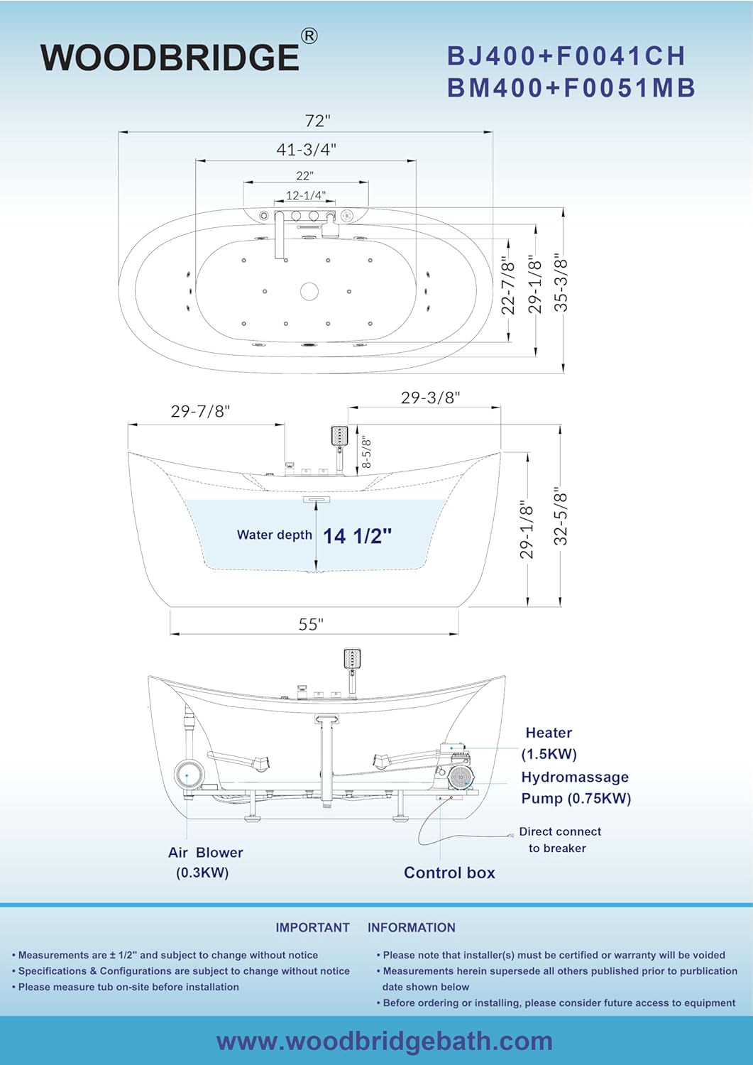 Be the first to review “WOODBRIDGE 72″ x 35-3/8″ Whirlpool and Air Bath Heated Soaking Combination Tub with Adjustable Speed Air Blower, Tub Filler, and LED control panel, Matte Black Finish Trim and Drain Kit,BM-400+F0051” Cancel reply